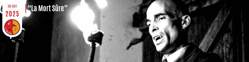 « Féru de lettres, un vampire pince sans rire nous convie, dans un bain de flammes et de sang, à célébrer notre mort à venir… jusqu’à ce que vie s’ensuive ! Dans une ambiance burlesco-lugubre, il déclame, danse, joue, découpe, jongle, enflamme, illusionne… Ce clown mort-vivant, maladroit face à la mort, livre son expérience singulière dans l’occulte, l’insolite et le fantastique. A grand renfort de poésie macabre, oxymores de rire et autres illusions phénoménales, La Mort Sûre revisite le folklore de l’Au-delà. De l’humour noir Grand Guignol pour futurs squelettes ! »